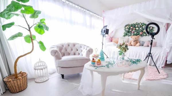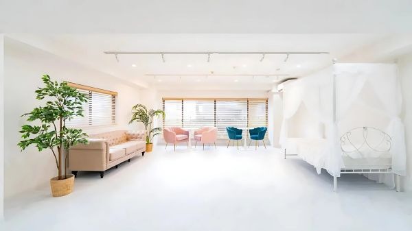 幅4m超えの大型窓とホワイトやパステルピンクなどの背景が4つも用意されているガーリー撮影に最適なスタジオ。天蓋付きのベッドやソファーなどの姫系家具に加え、テディベア、鳥籠、ケーキ、フラワーなどの撮影小物が豊富です。